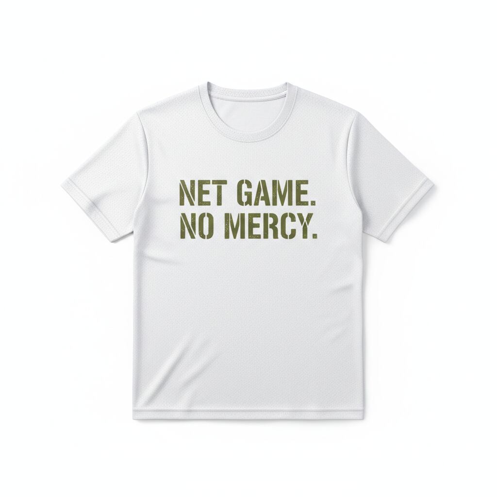 ネット際の攻防に容赦なし。アグレッシブなプレースタイルを宣言するデザイン。ポリエステル100% 吸水速乾ドライ素材。