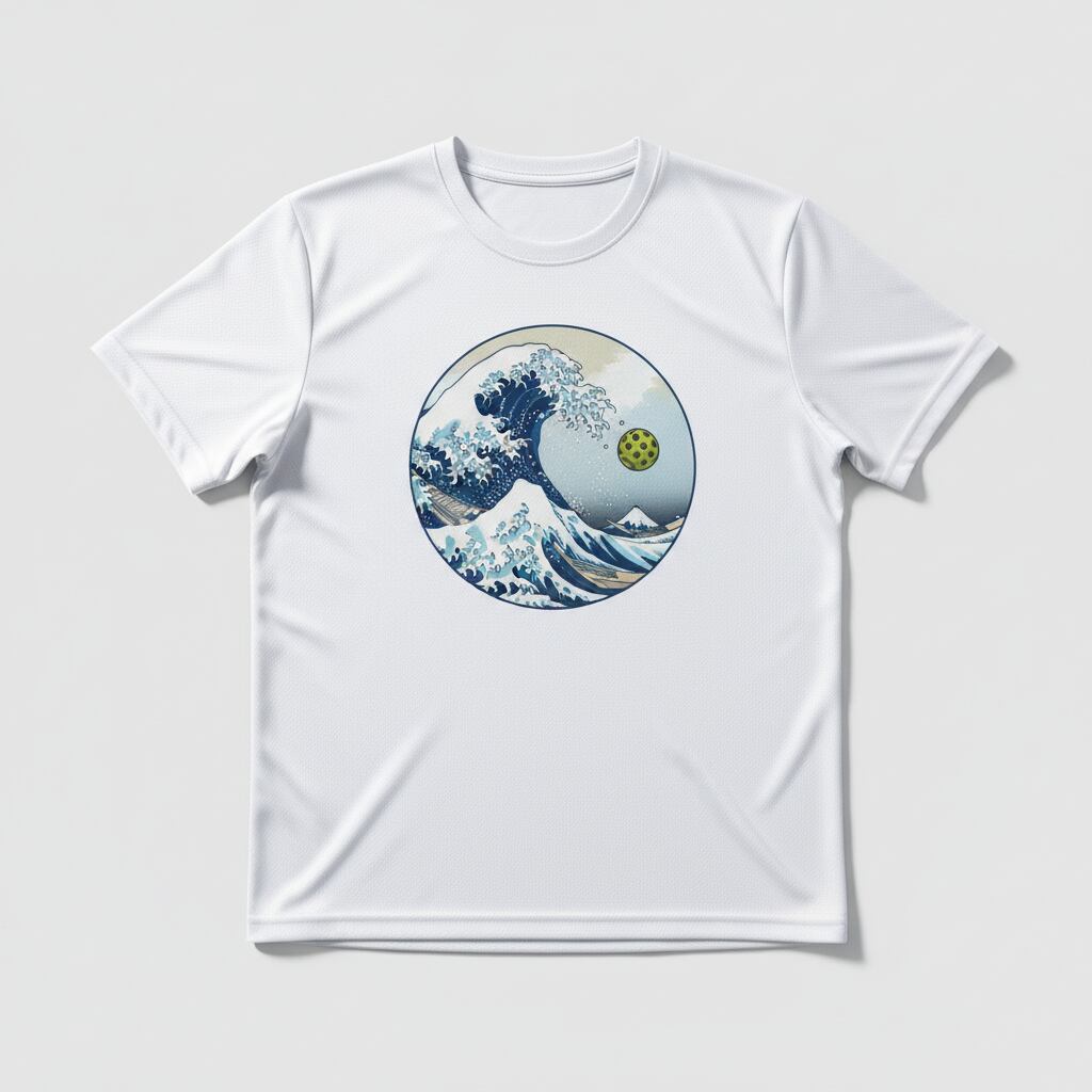 葛飾北斎の大波にピックルボールが乗る。和風×ピックルボールのアートフュージョン。ポリエステル100% 吸水速乾ドライ素材。