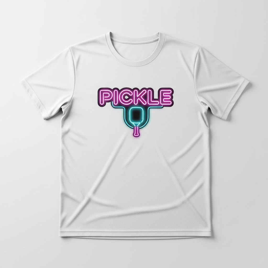 夜のネオンサイン風。バーの看板のようなレトロフューチャーなピックルボールデザイン。ポリエステル100% 吸水速乾ドライ素材。